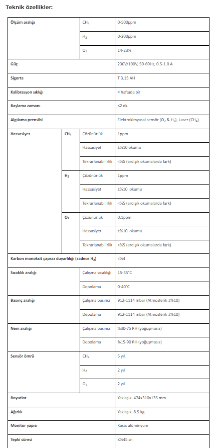 • Hidrojen (H2) : 0-200 ppm