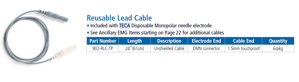 TECA Tek Kullanımlık Monopolar EMG İğne Elektrotları, elektromiyografi (EMG) ve sinir potansiyeli sinyalleri dahil olmak üzere biyopotansiyel sinyallerin uyarılması/kaydedilmesi için kayıt, izleme ve uyarı/kayıt ekipmanlarıyla birlikte kullanılmak üzere tasarlanmıştır.