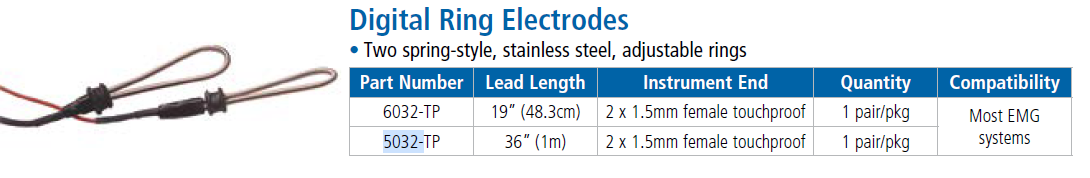 5032-TP Uyarıcı/Kayıt Dijital Halka Elektrotları İki yaylı, paslanmaz çelik, ayarlanabilir halka Uyumluluk: Çoğu EMG sistemi Cihaz Ucu: 1,5 mm dişi dokunmaya dayanıklı konektörler Kablo Uzunluğu: 36" (91 cm) Paketlenmiş: 1 çift/paket