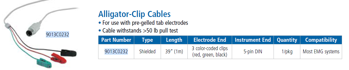 | 9013C0232 HUSH® Korumalı Timsah Klipsli Kablo Önceden jelleştirilmiş sekmeli elektrotlarla kullanım için Kablo, 50 lb'den fazla çekme testine dayanır Uyumluluk: Çoğu EMG sistemi Elektrot Ucu: 3 renk kodlu klips (kırmızı, yeşil, siyah) Cihaz Ucu: 5 pimli DIN konnektörü Kablo Uzunluğu: 39" (1 m) Paketlenmiş: 1/paket |