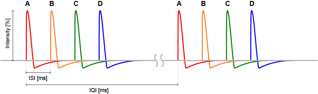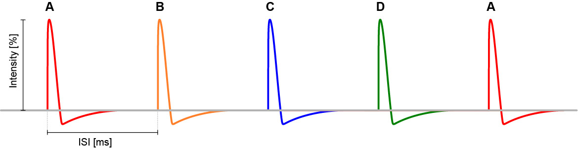 DuoMAG MP-Quad, dört adet DuoMAG MP stimülatörünü birleştirerek tamamen yapılandırılabilir bir dörtlü darbe (QPS) monofazik TMS sistemi sunar. Bu kombinasyon, tüm stimülatörlerin genliğinin ayrı ayrı kontrol edilmesine, uyarılar arası aralığın (ISI) ayarlanmasına ve tanımlanmış dörtlü darbe uyarımının tek bir bobin üzerinden verilmesine olanak tanır. Dörtlü darbe işlevi, kullanıcılara hassas eşik altı ve eşik üstü koşullandırma ve test darbeleri verme olanağı sağlar; bu da korteks içi ve korteksler arası inhibisyon ve kolaylaştırmayı incelerken hayati bir bileşendir. Dört darbe için uyarılar arası aralık, birlikte verilen kontrol yazılımında veya TTL girişleri aracılığıyla harici kontrol yoluyla ayarlanabilir ve ISI kontrolünde en üst düzeyde esneklik sunar. DuoMAG MP-Quad, kullanıcıların iki stimülatör darbesini tek bir darbede birleştirmesine olanak tanıyarak, tek bir DuoMAG MP çıkışının %134'üne eşdeğer bir darbe genliği sağlar. DuoMAG Quad, interhemisferik (dörtgen) stimülasyon gerçekleştirmek için dört ayrı bobinle de kullanılabilir.