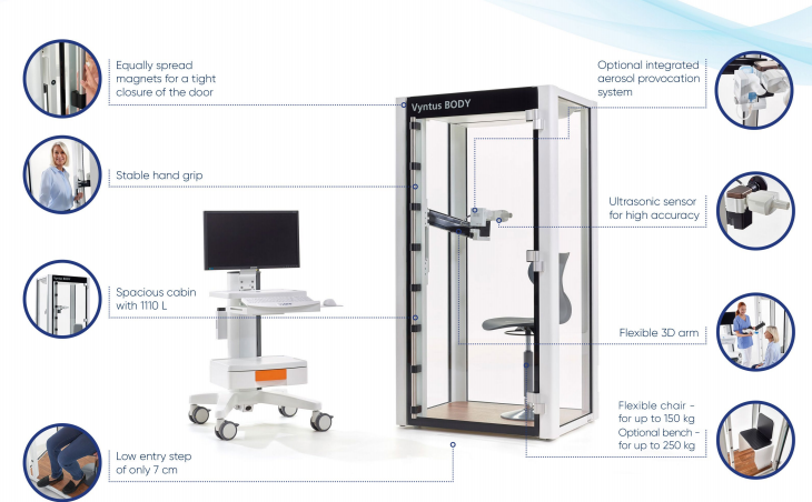 Vyntus™ BODY, yenilikçi gövdesi ile maksimum esnekliğe sahip olup, pletismografi ölçümlerinde zamandan tasarruf etmenizi sağlamak üzere tasarlanmıştır.
